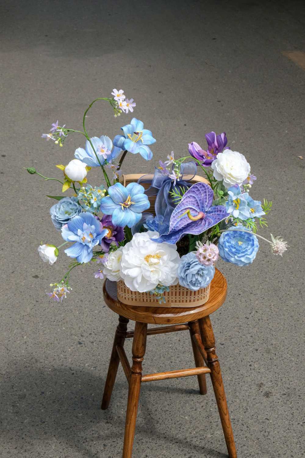 Giỏ hoa mix mẫu đơn, tulip và lá môn tone xanh tím thanh lịch, kết hợp cùng chi tiết hoa lụa cao cấp tinh tế. Món quà này mang đến vẻ đẹp dịu dàng, sang trọng và đầy ý nghĩa. Sắc xanh tím hài hòa tạo cảm giác bình yên, vừa tinh tế vừa cuốn hút ánh nhìn. Từng chi tiết tỉ mỉ của hoa lụa khiến giỏ hoa trở thành lựa chọn hoàn hảo để gửi gắm tình cảm và khoảnh khắc đáng nhớ.