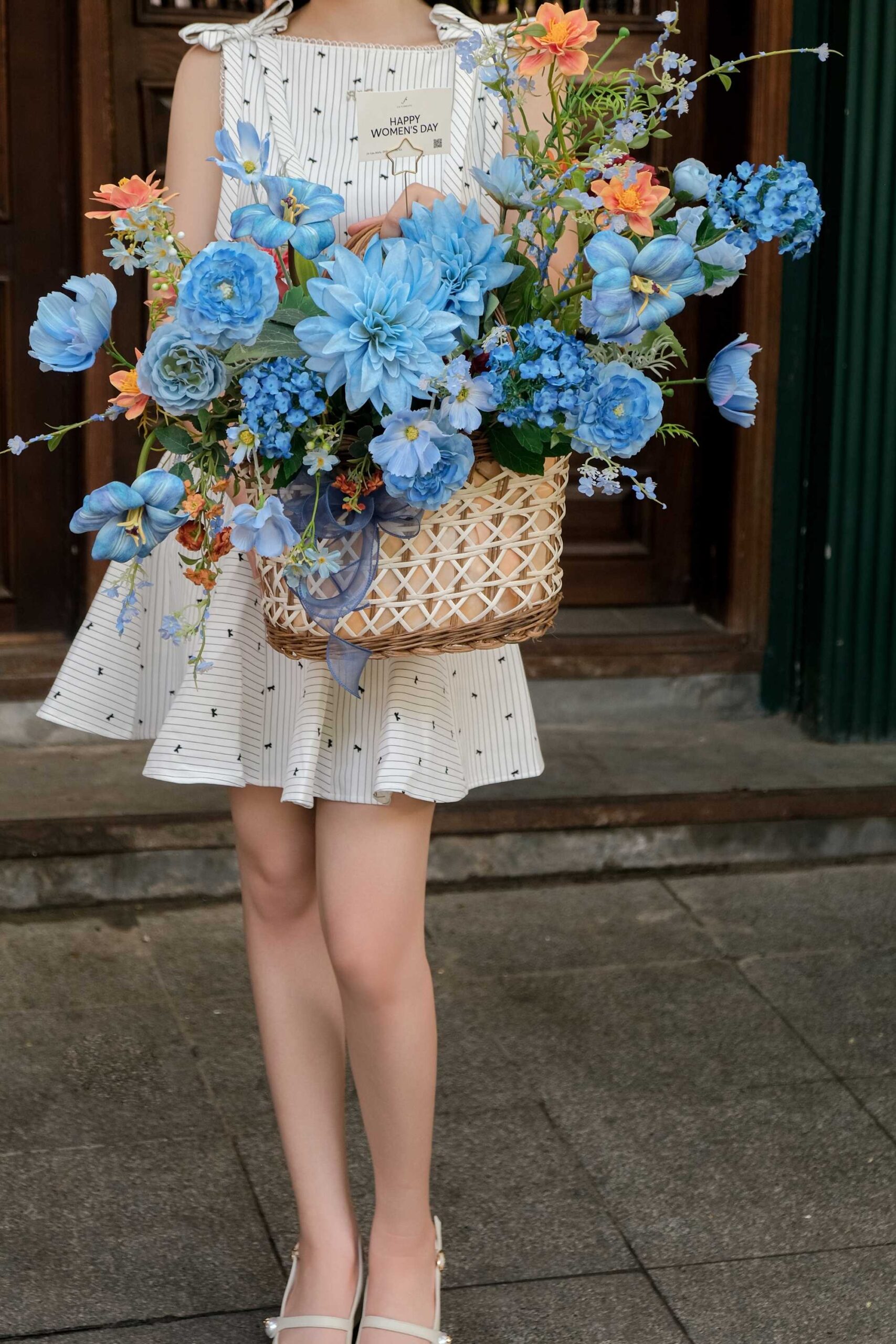 Giỏ hoa mix thược dược mẫu đơn tulip tú cầu nhỏ tone lam