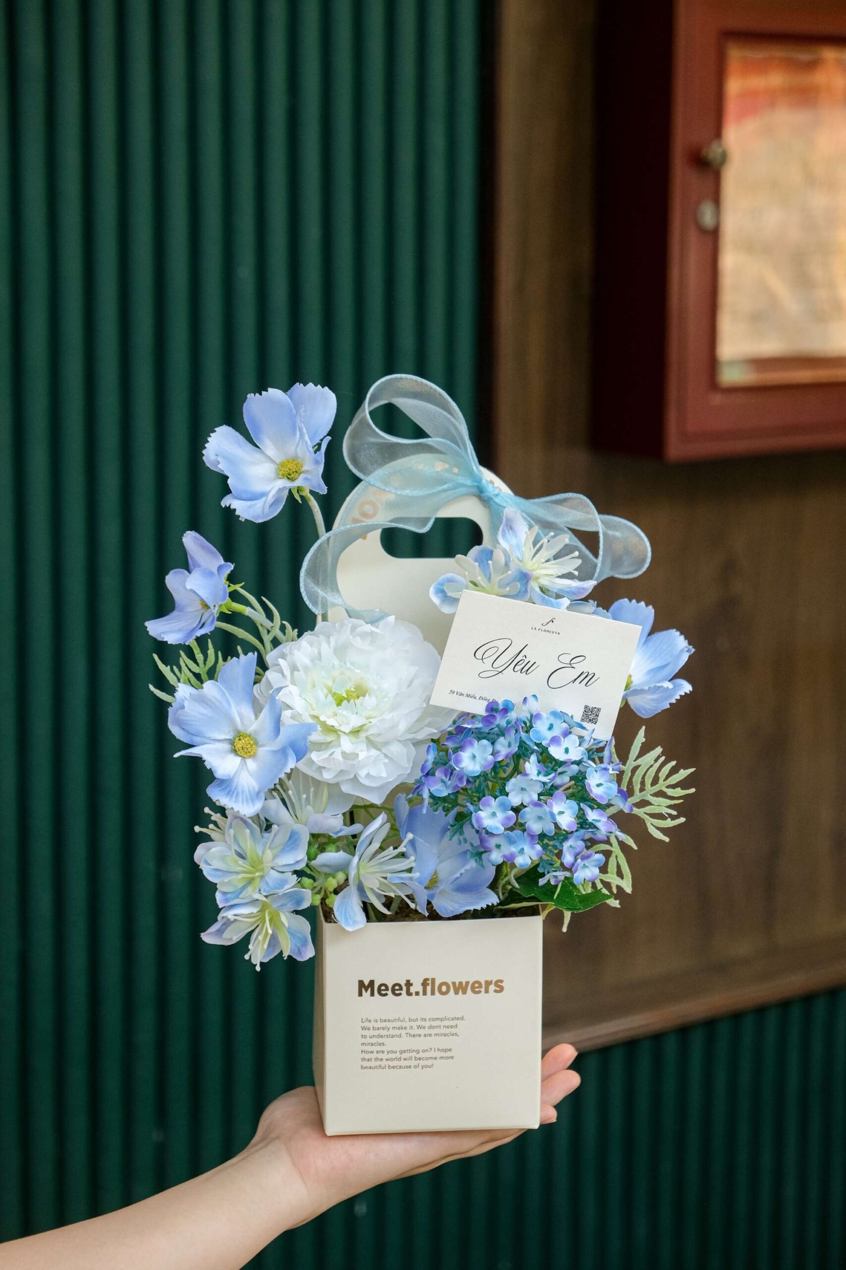 Túi hoa lụa cao cấp mix mẫu đơn, tú cầu và cúc bướm tone lam trắng mang đến vẻ đẹp thanh thoát, dịu dàng và tinh tế. Gam màu lam trắng nhẹ nhàng hòa quyện tạo nên món quà sang trọng, tràn đầy yêu thương để gửi đến người đặc biệt. Những bông hoa được sắp xếp khéo léo, gợi cảm giác mềm mại nhưng vẫn trang nhã. Đây là lựa chọn tuyệt vời để trao gửi tình cảm chân thành và ghi dấu những khoảnh khắc đáng nhớ.
